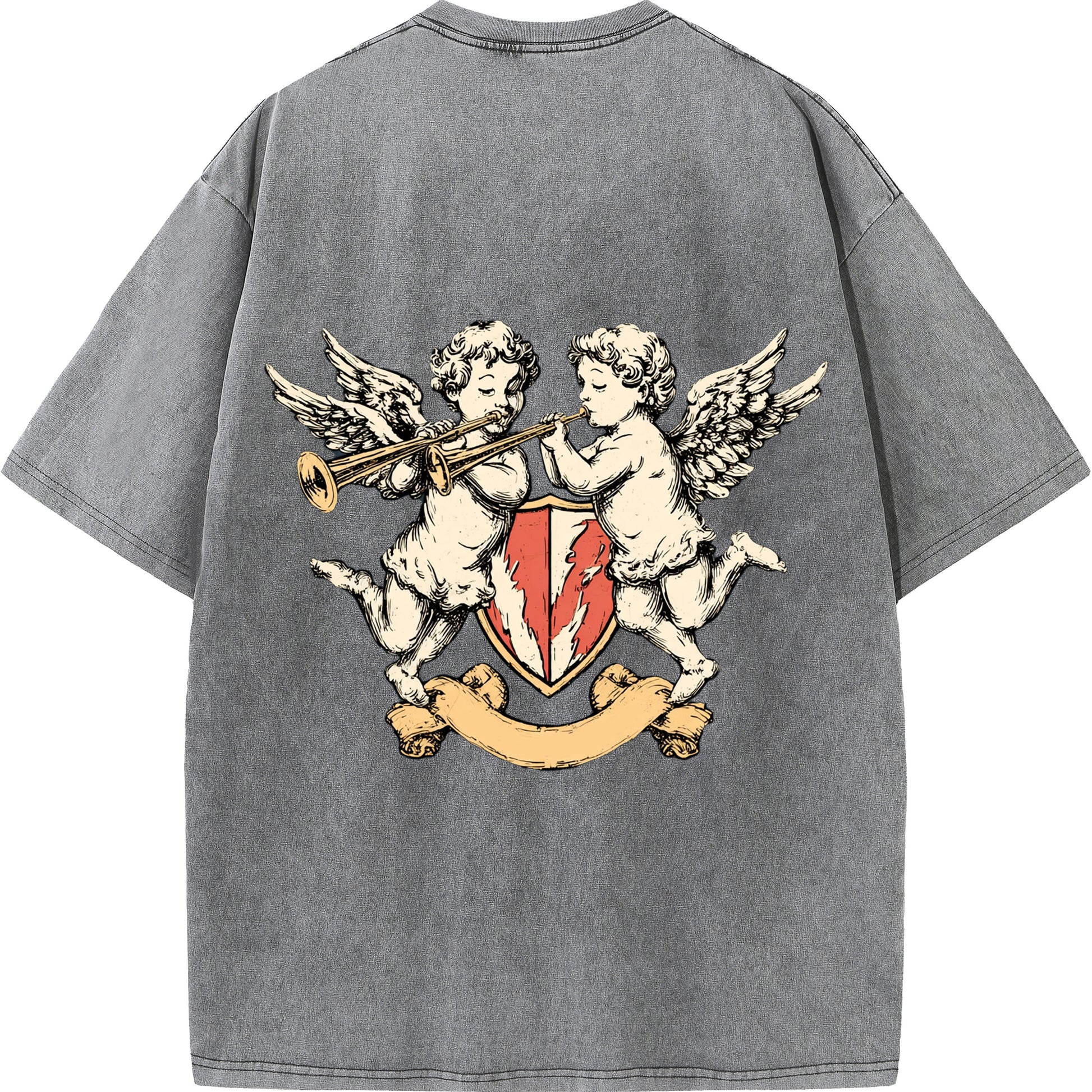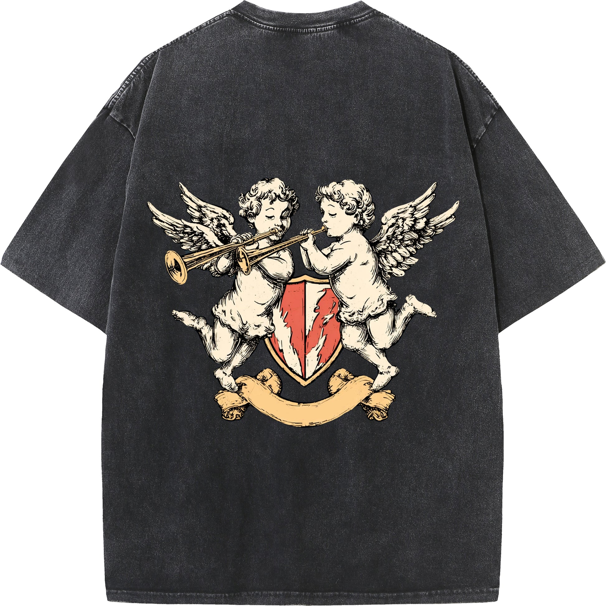 Experience a blend of art and spirituality with our Angelic Harmony Faith T-Shirt. This captivating design showcases cherubic angels playing trumpets, guarding a heraldic shield on the back, while the front features an inspiring scripture on faith. Perfect for those who cherish both style and meaning.