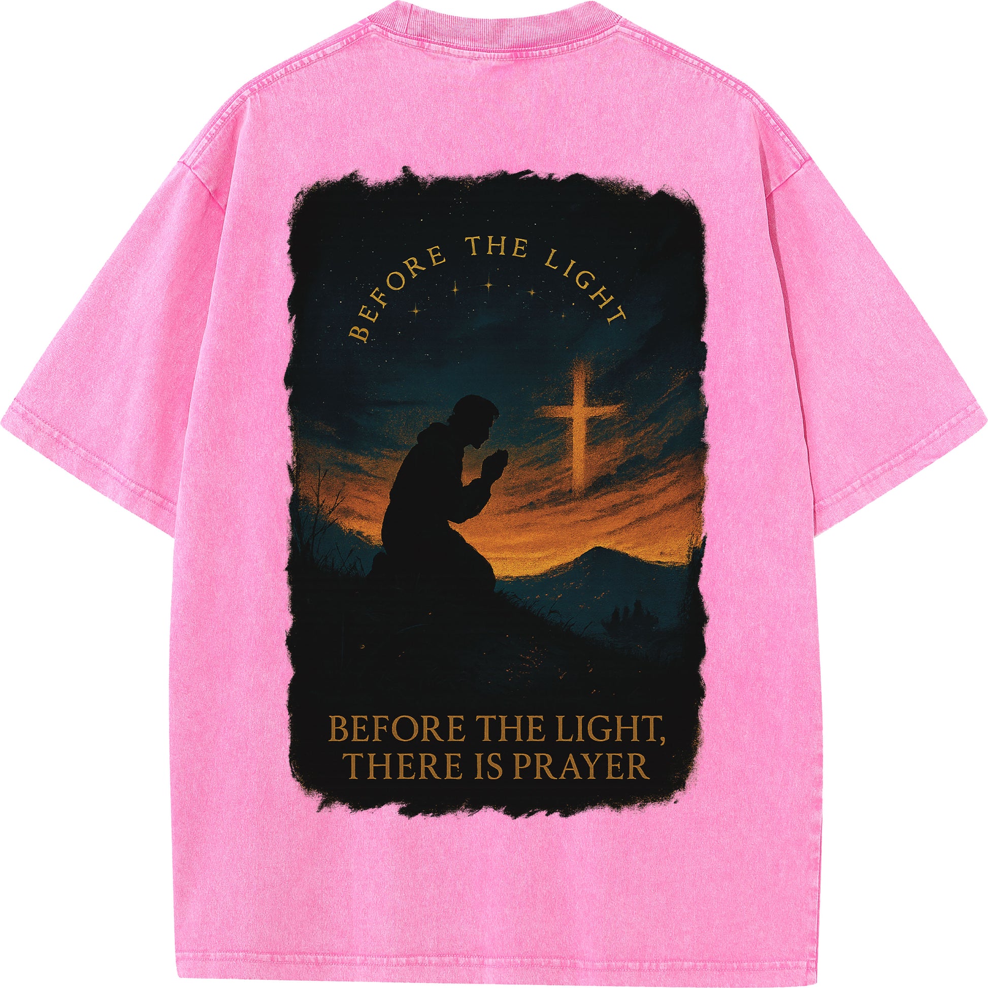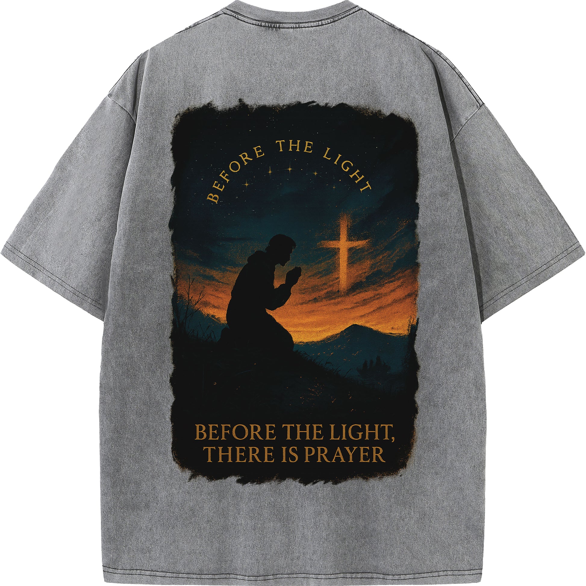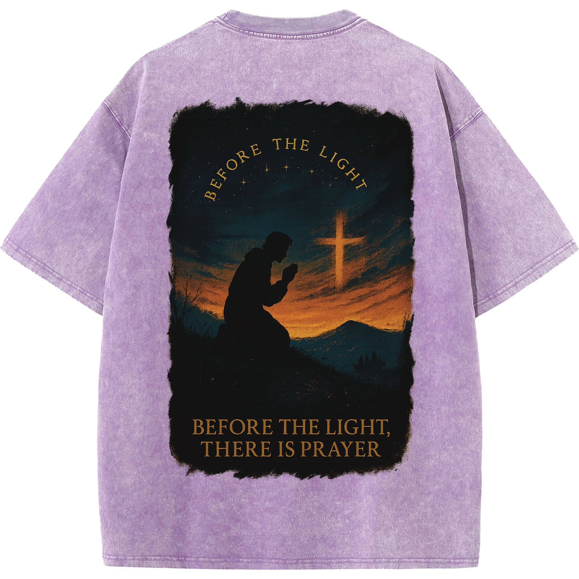 Embrace your faith in style with our "Before The Light, There Is Prayer" vintage washed tee. Featuring a powerful silhouette of a man in prayer beneath a glowing cross and a beautiful sunset sky, this shirt reminds us of the strength found in devotion. Made from premium cotton with a faded, stonewashed finish, it offers both comfort and timeless spiritual expression. Perfect for church gatherings, faith-based events, or everyday wear for those who walk with purpose.