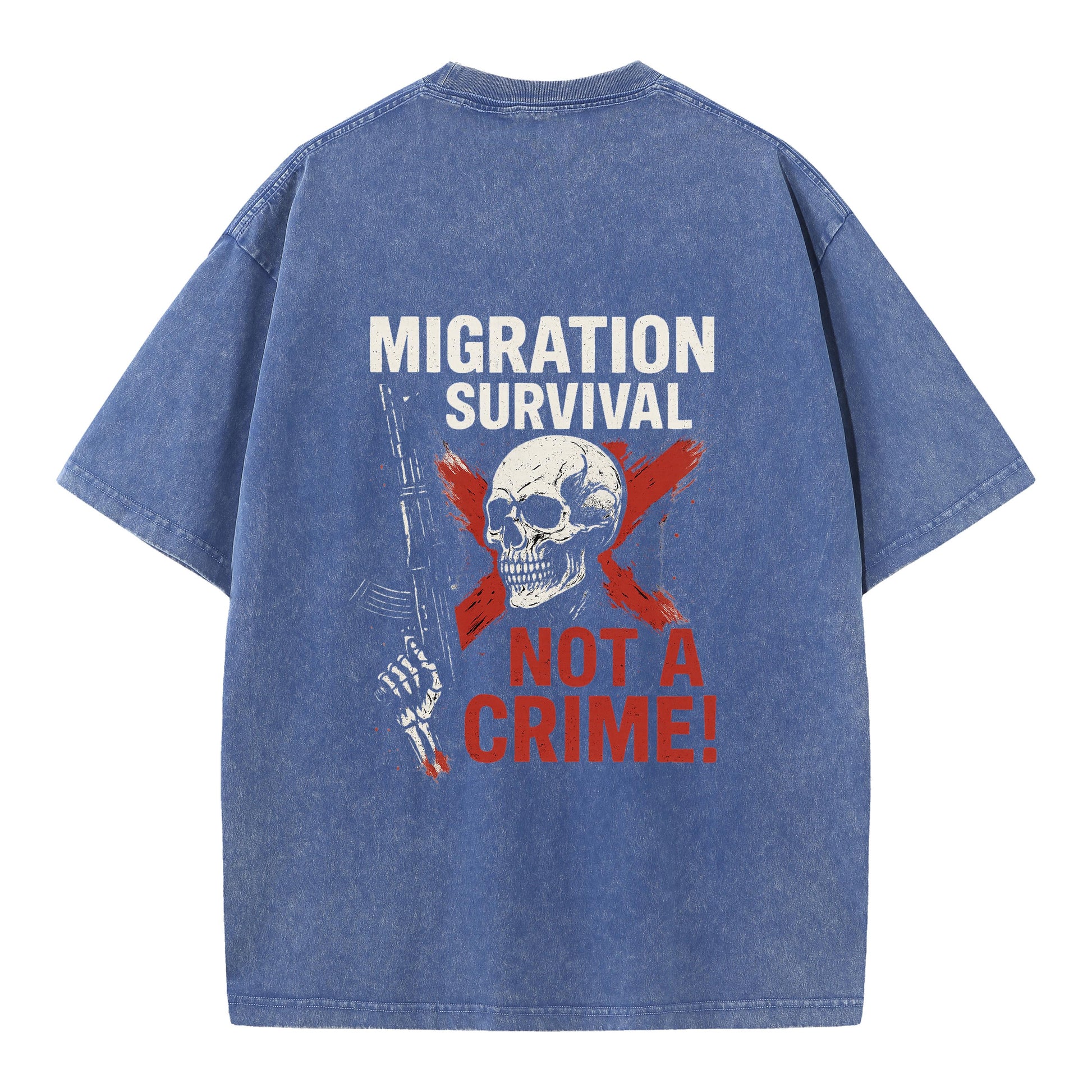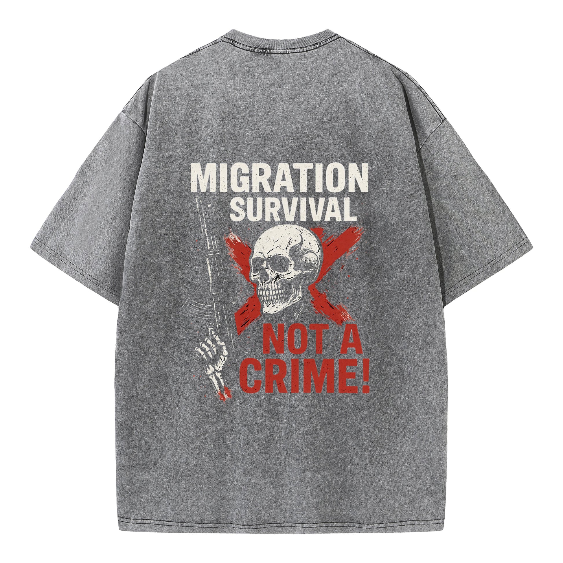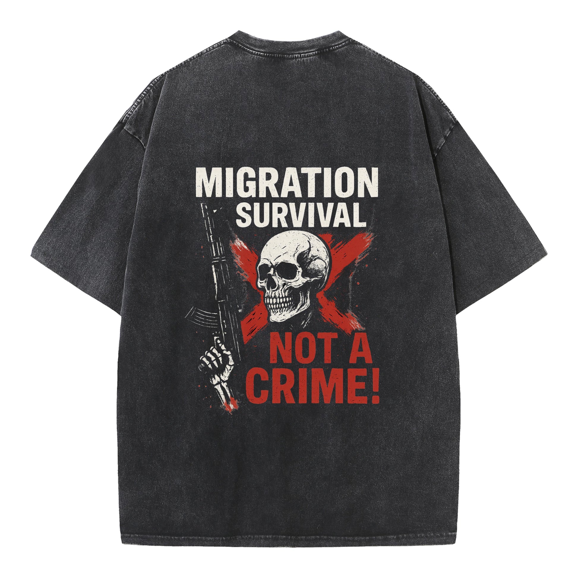 • ๐ŸŽฏ Back Graphic: Skull with rifle, red X, and bold message: "Migration Survival Not a Crime!"