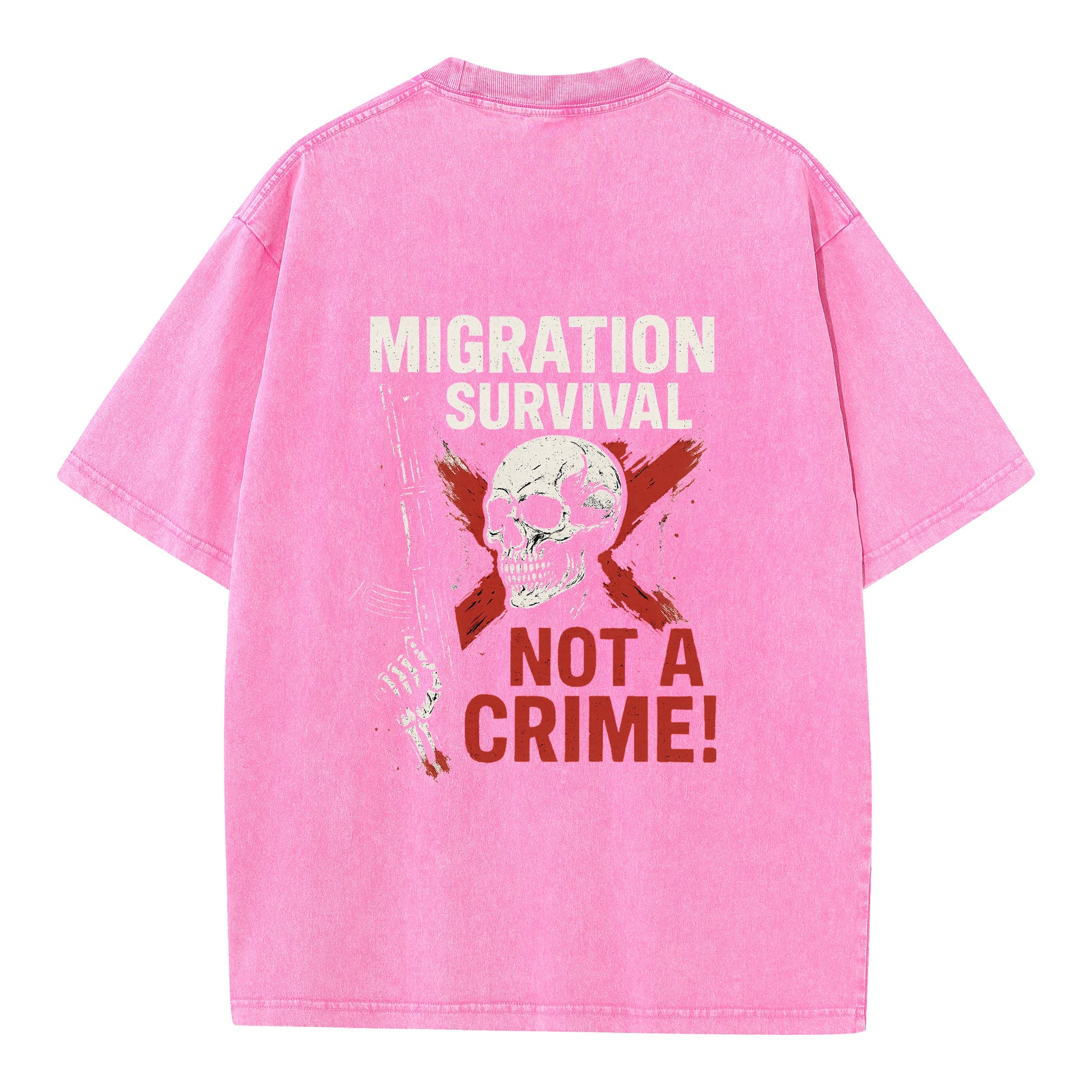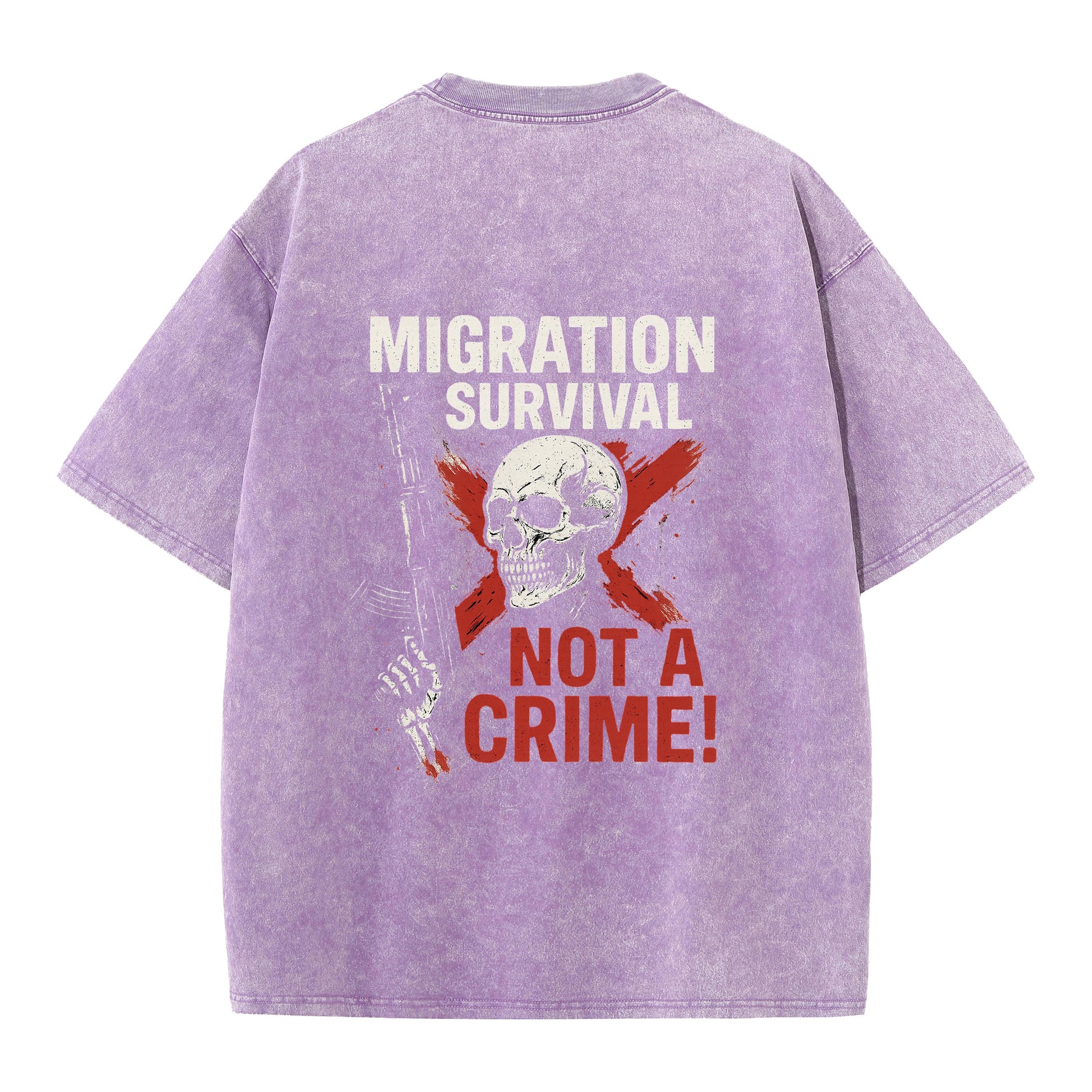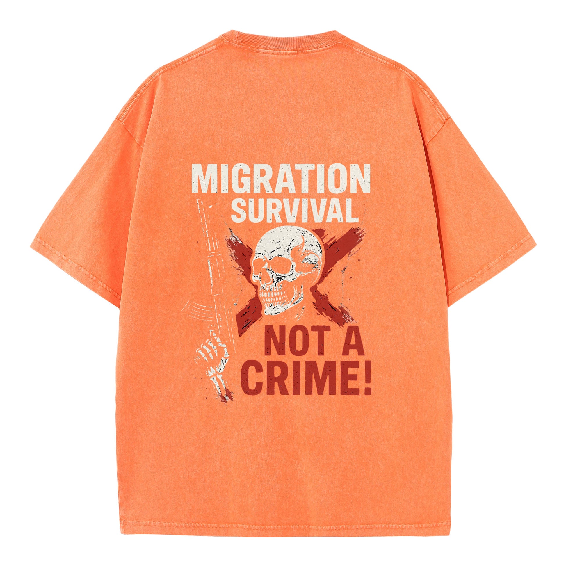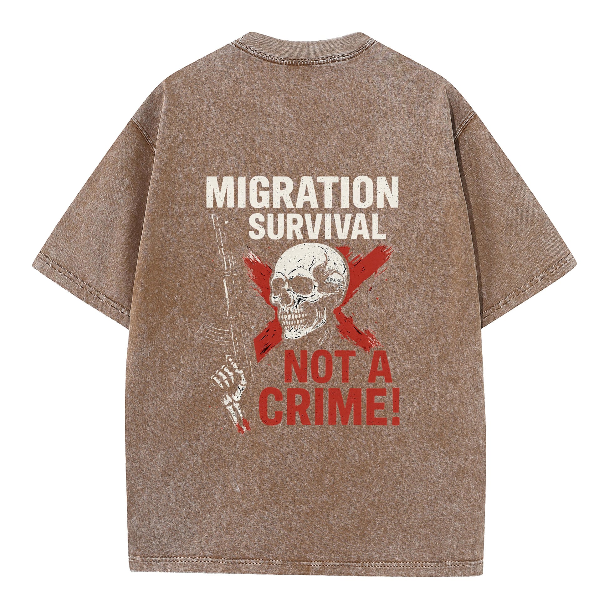• ๐ŸŽฏ Back Graphic: Skull with rifle, red X, and bold message: "Migration Survival Not a Crime!"