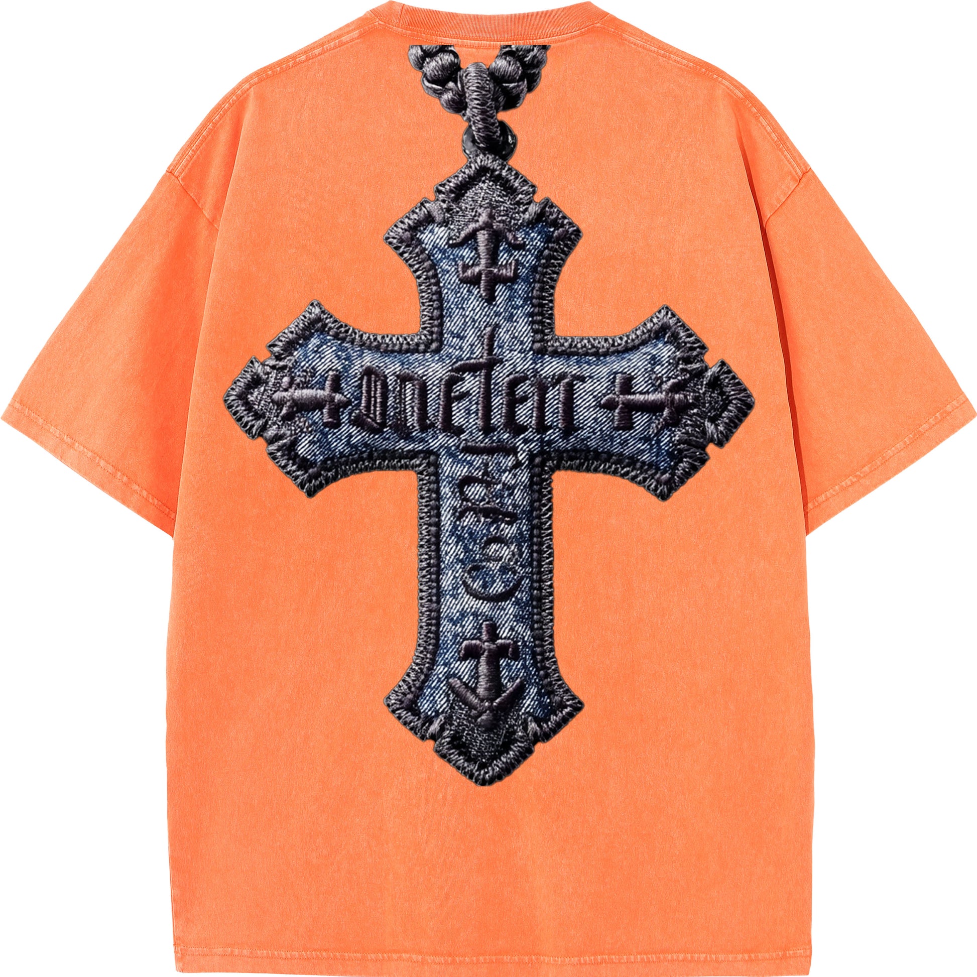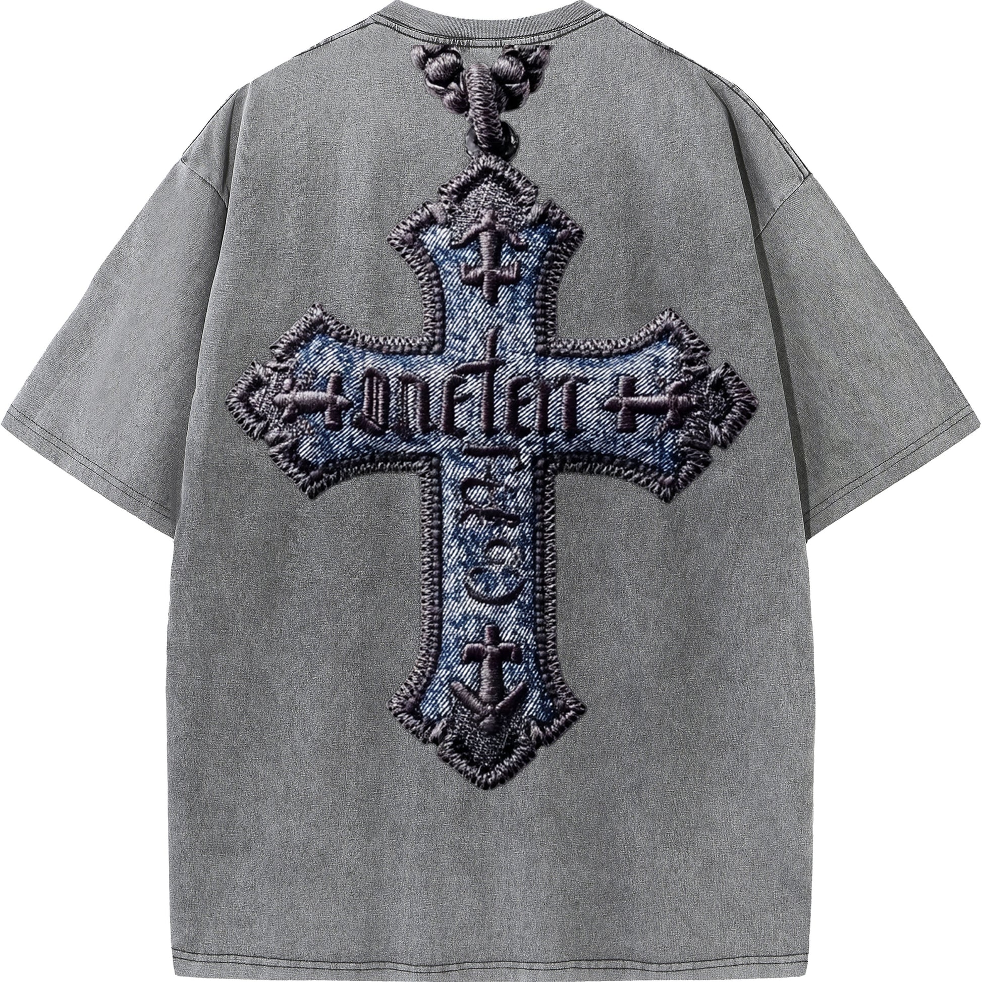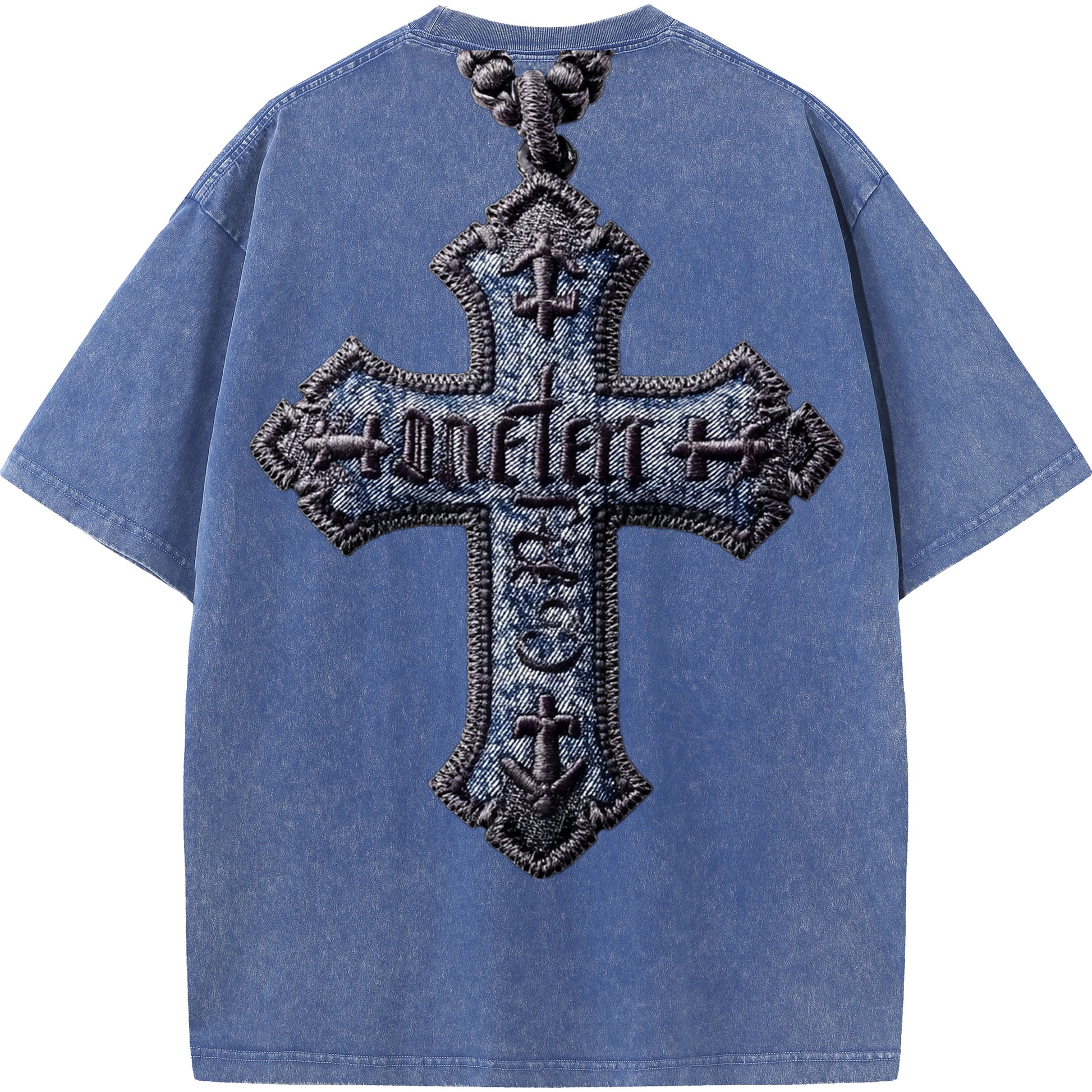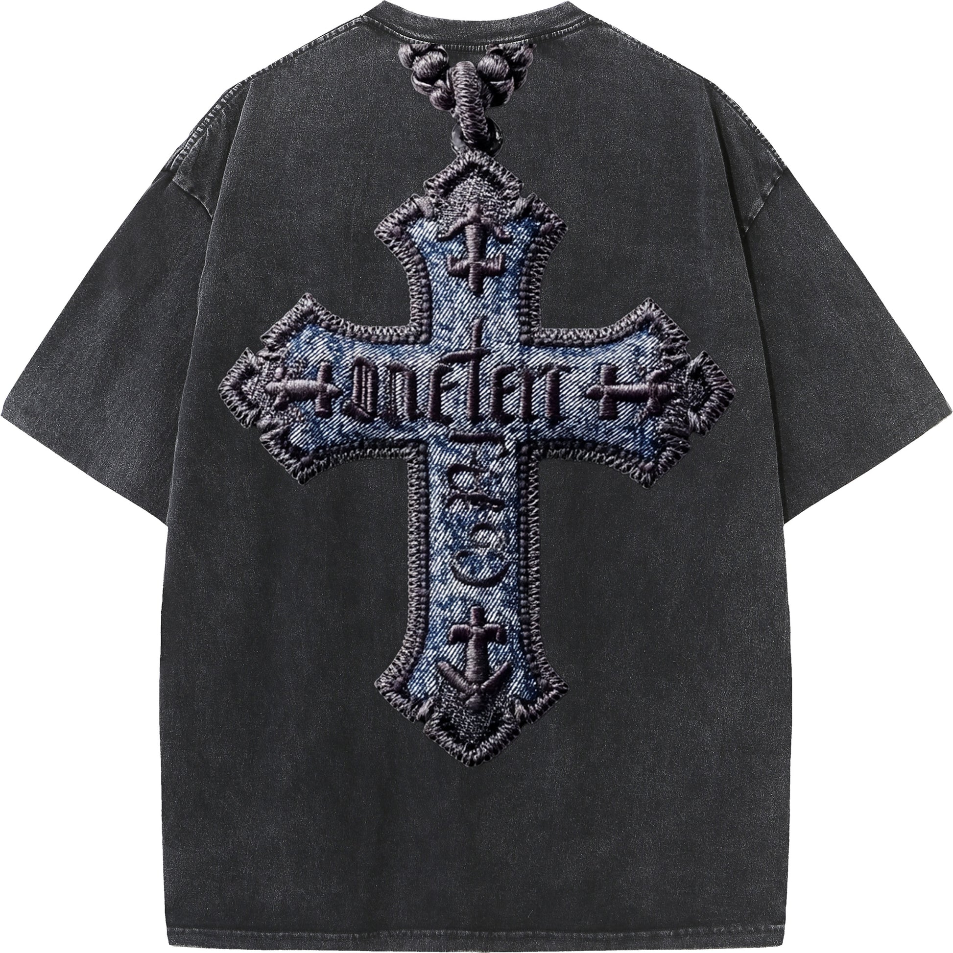 A bold, three-dimensional cross made from stitched denim and thick embroidery. Ancient gothic-style text weaves across the cross, turning your back into a wearable statement of faith and power.