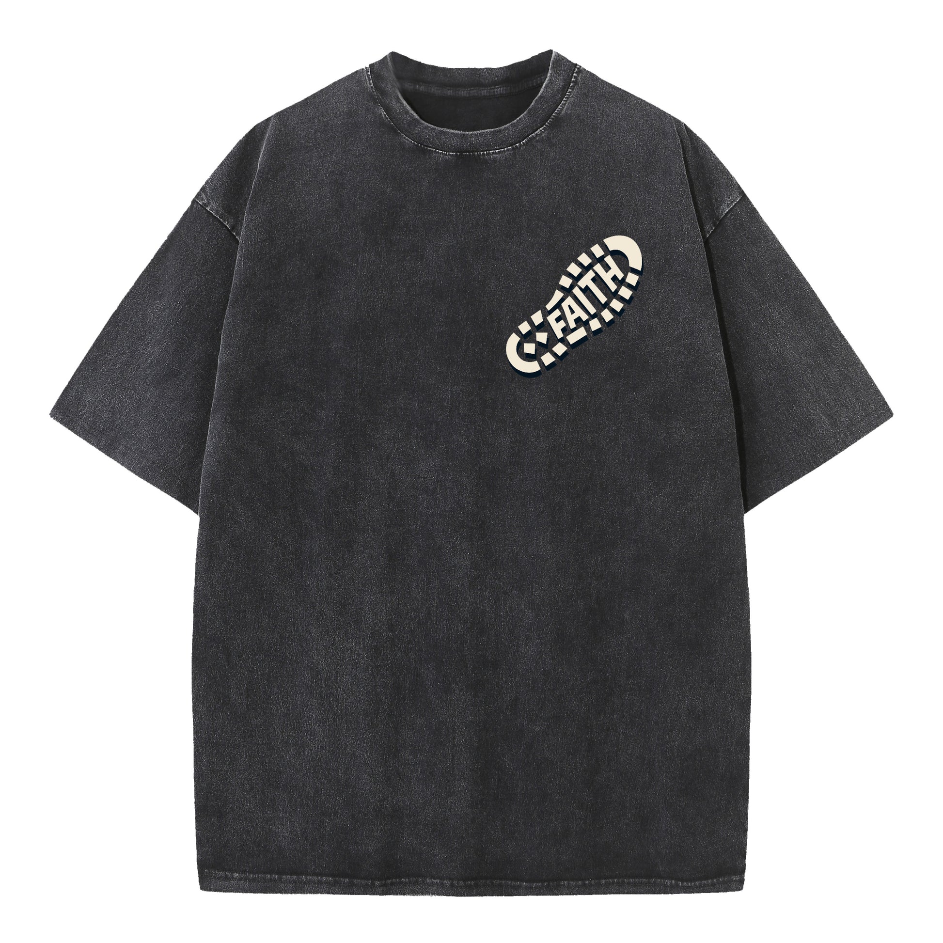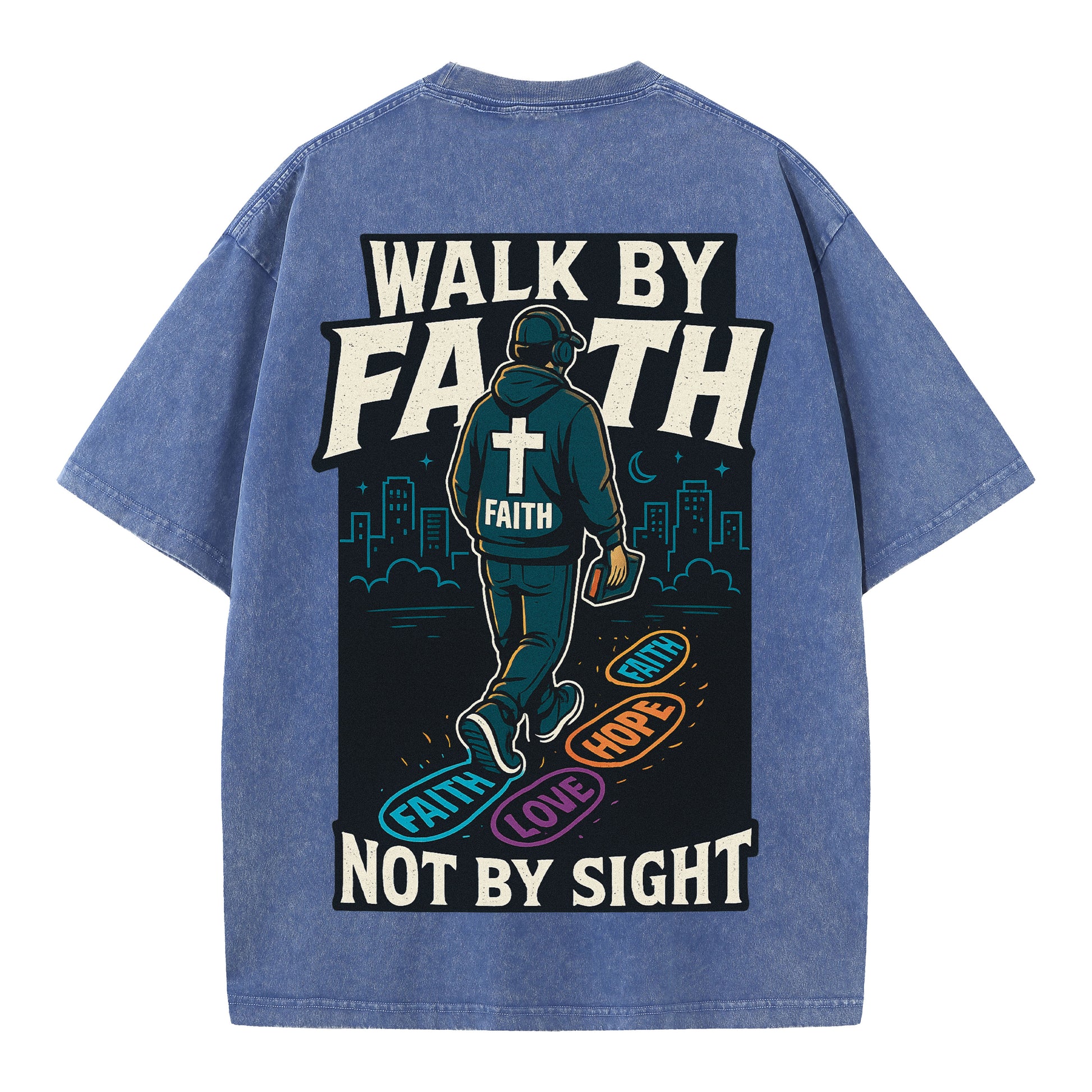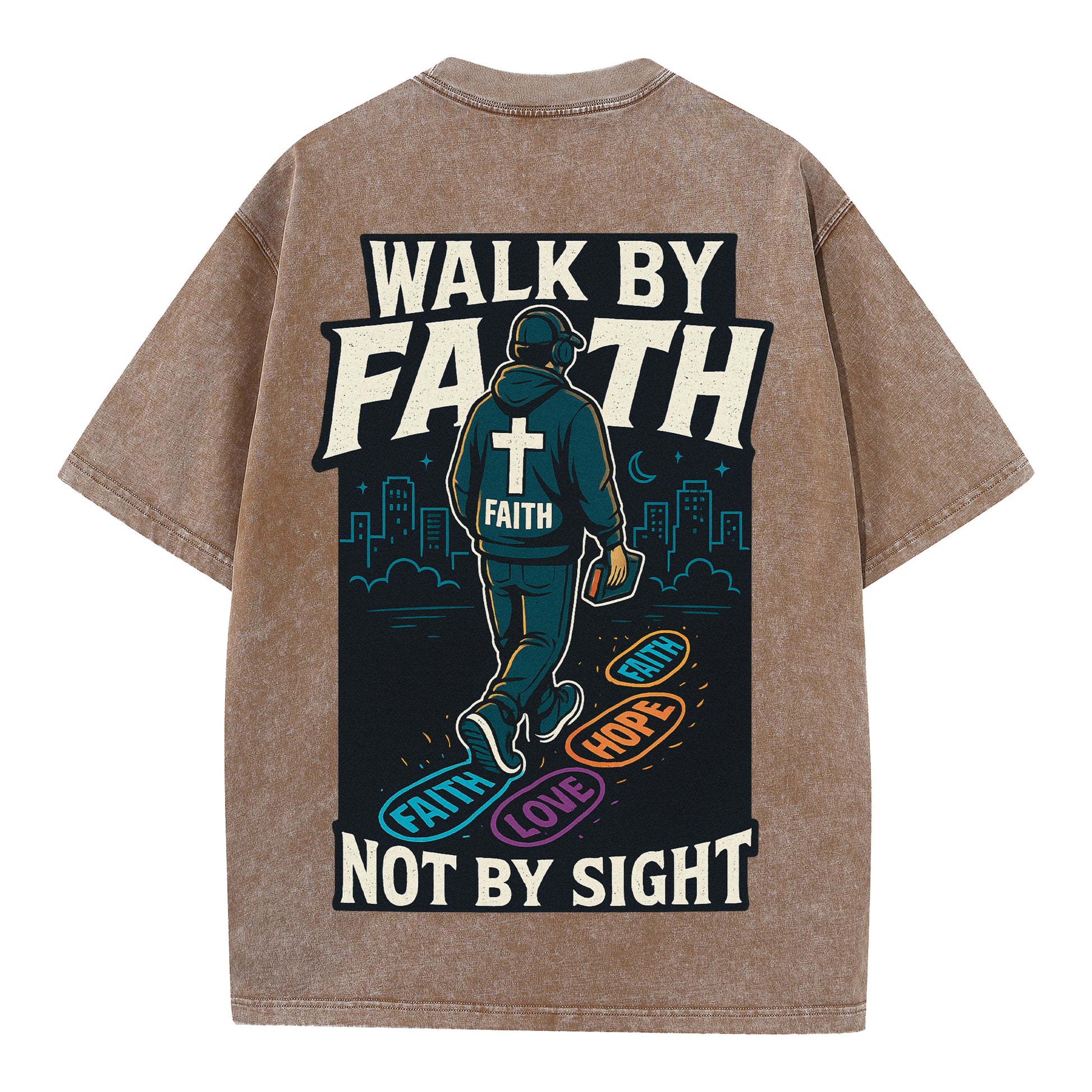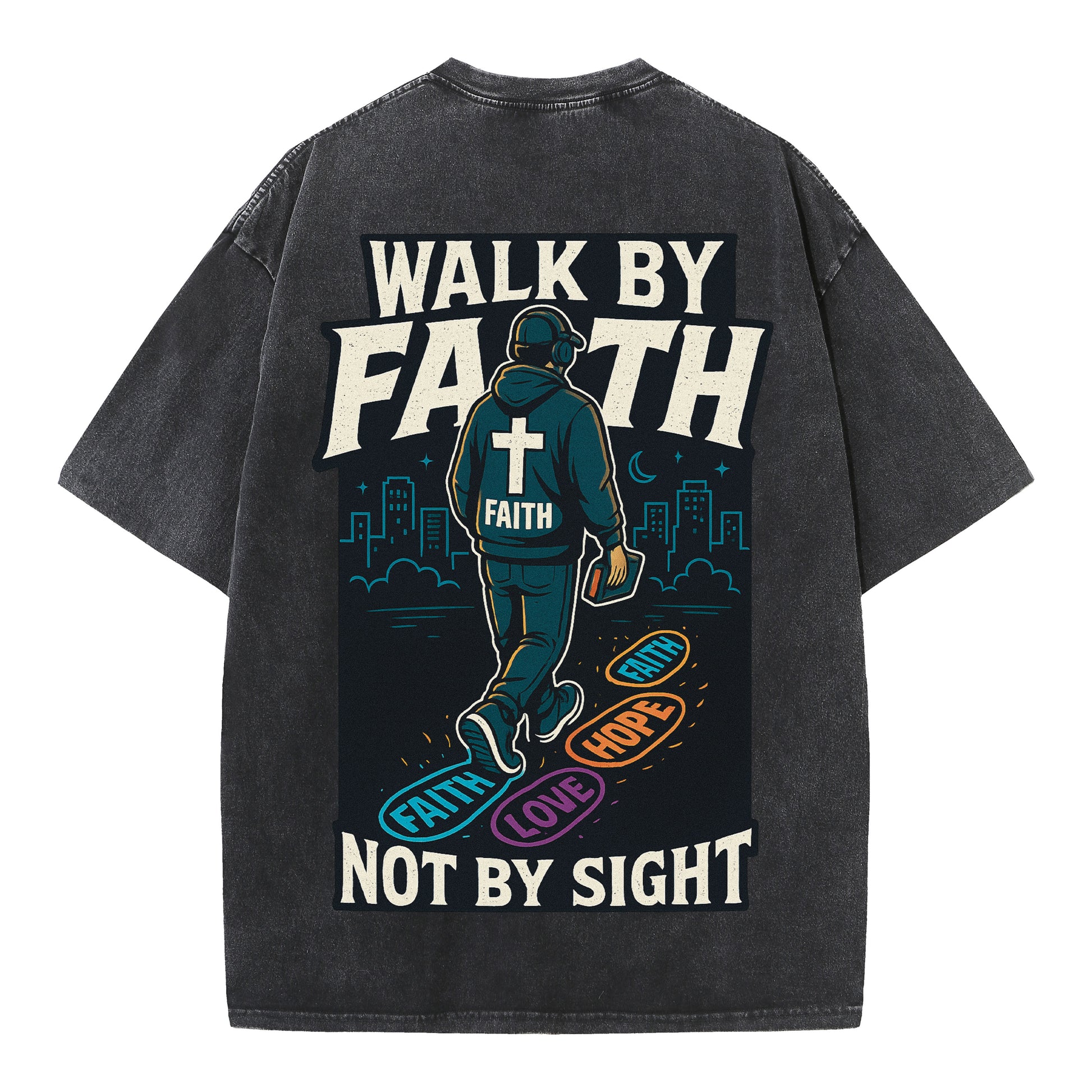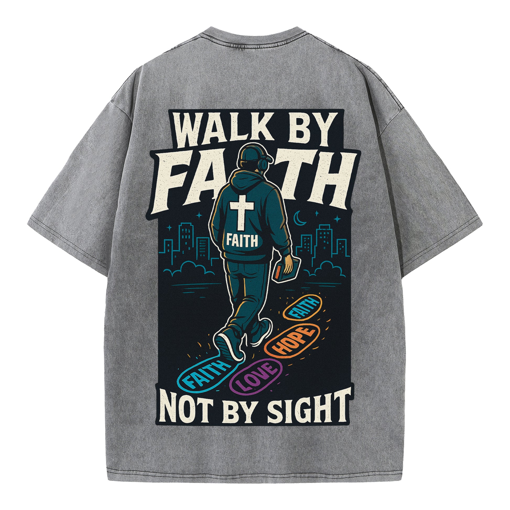 Walk by Faith – Vintage Washed Oversized Christian Streetwear Tee - 1